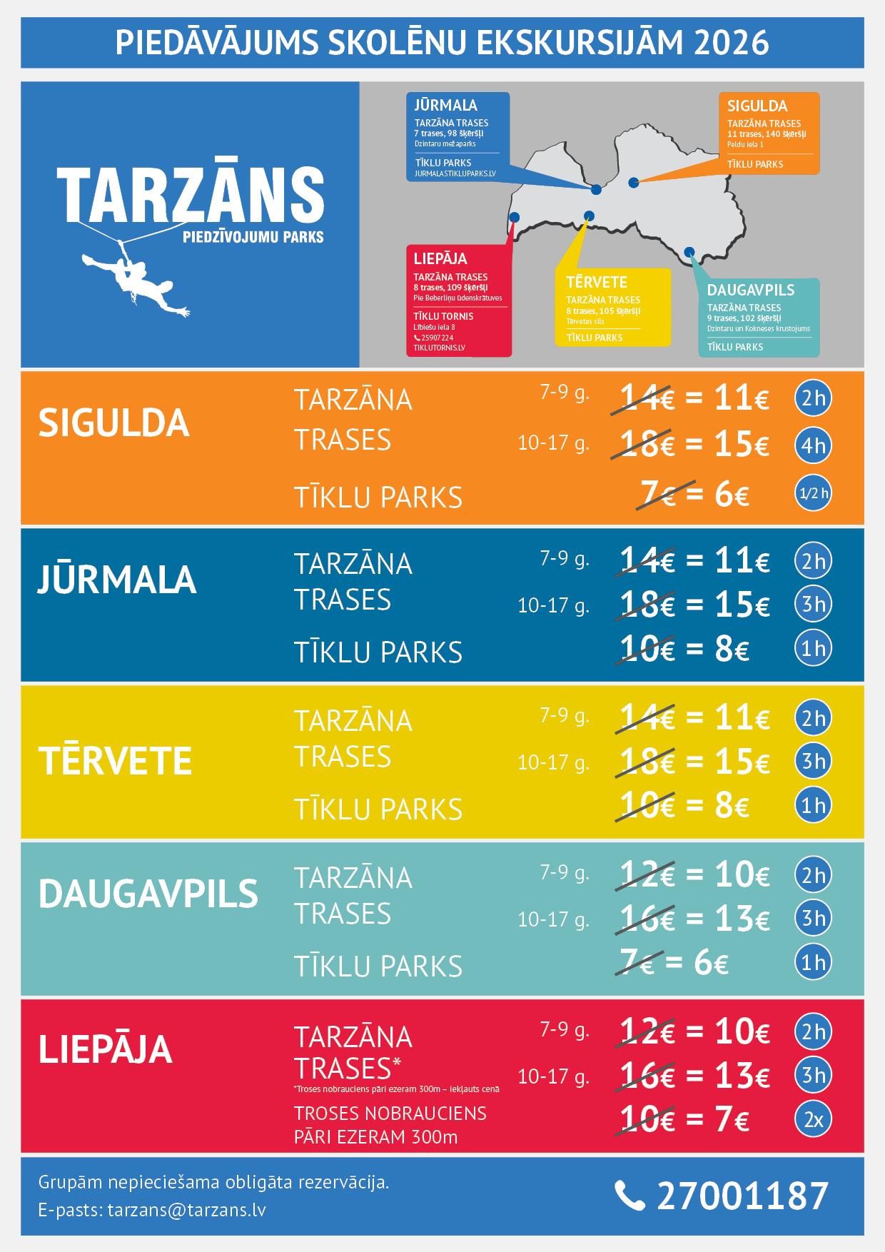 Mandatory reservation required by calling + 371 27001187 or writing email tarzans@tarzans.lv